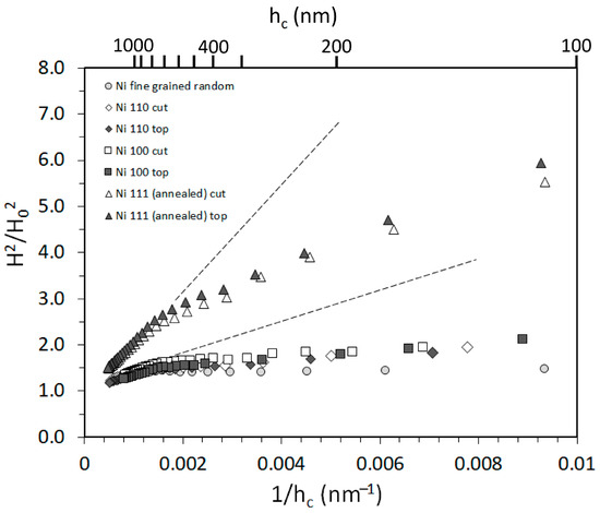 The depth dependence of the hardness in the form of normalised H2 vs. 1/h plots is shown in Figure 8. The Nix–Gao model (dashed lines) according to Equation (1) fits the data well for depths higher than around 1 µm, then it deviates. It is also worth noting that after normalisation, the samples with a columnar grain structure show very similar curves regardless of the texture fibre ([100] or [110]) or the indentation direction (top or cut).