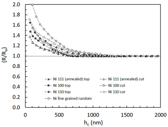 The ratio of effective plastic zone expansion is shown in Figure 9. It can be seen that the deviation from the Nix–Gao model becomes larger with decreasing grain size. It is also evident that the deviation from the Nix–Gao model starts earlier with decreasing grain size. This trend is apparent from the identified parameters of the modified Nix–Gao model (Table 1).