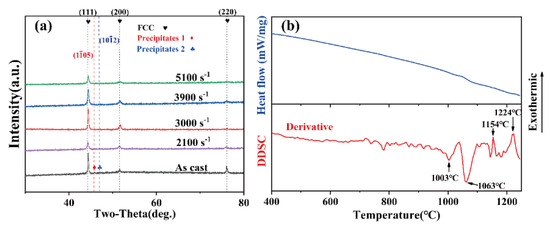 Figure 1. (a) XRD pattern of the CoCr0.4NiSi0.3 alloy before and after dynamic compression. (b) DSC curves of the CoCr0.4NiSi0.3 alloy in as-cast state.