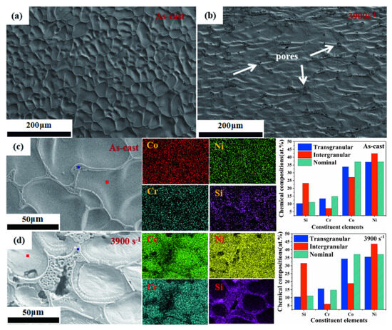Figure 2. Microstructure of the CoCr0.4NiSi0.3 alloy (a) as-cast, (b) at a strain rate of 3900 s−1. The chemical compositions and distribution of CoCr0.4NiSi0.3 alloy (c) as-cast state and (d) at a strain rate of 3900 s−1. The blue and red squares in (c) and (d) respectively represent the areas of composition analysis in transgranular and intergranular, respectively.