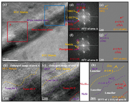 The high-resolution transmission electron microscopy (HRTEM) images in Figure 3 reveal the presence of lamellar HCP structure precipitates within the sub-grain boundaries of the as-cast MEA. The enlarged HRTEM images of area A and B in Figure 3a, displayed in Figure 3b and Figure 3c, respectively, exhibit nano-scale HCP precipitates in gray-black and bright grey. The fast Fourier transformed (FFT) images of area A and B in Figure 3a, shown in Figure 3d and Figure 3f, respectively, illustrate the FCC matrix along with two HCP precipitates exhibiting a slight lattice mismatch. The inverse fast Fourier transformed (IFFT) images corresponding to the crystallographic plane (002) of areas A and B are illustrated in Figure 3e and Figure 3g, respectively. These two HCP precipitates are identified as a eutectic structure consisting of Ni31Si12 (gray-black region) and Ni2Si (bright grey region), as depicted in Figure 3e and Figure 3g [34]. Moreover, intricate lamellar precipitates can be observed on the IFFT image corresponding to the (–111) plane in area B.
