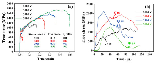 Figure 4. (a) SHPB test pattern of the CoCr0.4NiSi0.3 alloy. (b) The initial time of stress collapse after dynamic compression at different strain rates adjusted by zeroing.
