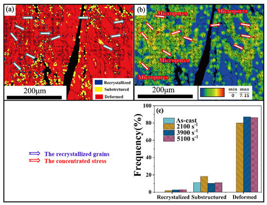 Figure 6a,b depict the EBSD mappings of dynamic recrystallization and strain contour for CoCr0.4NiSi0.3 alloy under a strain rate of 5100 s−1. Cracks, which are likely to have developed in the compression direction due to shear banding, can be identified on the surface of the cross section. As indicated by the arrows in Figure 6a, there are only a small number of recrystallized grains located close to cracks and micropores within the specimen. Dynamic recrystallization mainly takes place around grain boundaries where stress concentrates, indicating that an adiabatic temperature increase is usually not typically associated with it. The microstructure observed in specimens following dynamic compression mostly comprises distorted grains, as demonstrated by Figure 2b. When the strain rate is in the range of 2100 to 5100 s−1, the percentage of deformed grains varies from 79.98% to 87.21% as illustrated in Figure 6c, while the proportion of dynamically recrystallized grains increases from 1.75% to 2.87% with an elevated strain rate.