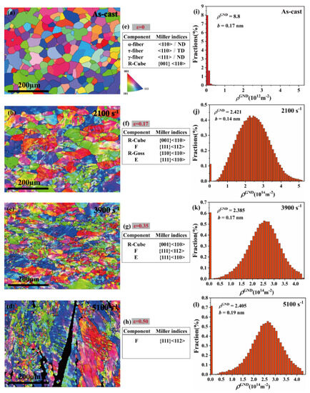 Figure 9. EBSD-IPFs maps of (a) as-cast, and dynamically compressed at a strain rate of (b) 2100 s−1, (c) 3900 s−1, and (d) 5100 s−1. Texture evolution of (e) as-cast, (f) 2100 s−1, (g) 3900 s−1, and (h) 5100 s−1. The frequency histograms show GND density in the state of (i) as-cast, (j) 2100 s−1, (k) 3900 s−1, and (l) 5100 s−1.