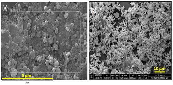 (a,b) SEM images of the CeO2/CS/GO ternary nanocomposite.