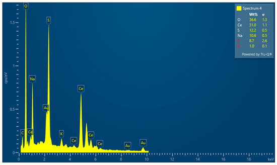 The surface morphology of the CeO2/CS/GO ternary nanocomposite is shown in Figure 2a,b and its elemental composition is presented in Figure 3 and Table S1, respectively. Figure 3 depicts the elemental compositions of the CeO2/CS/GO ternary nanocomposites, which included O-36.6, Ce-31.0, S-12.2, and C-8.7, etc. Figure 2a,b affirm the non-agglomerated surface of the developed CeO2/CS/GO ternary nanocomposite. This surface topography improves the biopotential of the developed CeO2/CS/GO ternary nanocomposite, and the same is addressed in the below sections.