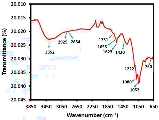 The presence of different functional groups and their bonding in the developed CeO2/CS/GO ternary nanocomposite were confirmed by recording the FT-IR spectrum of the sample (3500–1000 cm–1), as shown in Figure 4. In this spectrum, the FT-IR peaks of GO can be located at different positions, such as the peaks of hydrogen-bonded O–H (3100–3600 cm−1), C=O (1731 cm−1), C=C (1623 cm−1), and C–O (1222 cm−1, 1053 cm−1). On the other hand, FT-IR peaks of chitosan in the same spectrum can be identified at 3410 cm −1 (O–H and N–H), 2925 cm −1, 2854 cm −1 (aliphatic C–H), 1655 cm −1 (bending vibration N–H), 1420 cm −1 (C–N), and 1080 cm −1 (C–O). Whereas, FTIR spectra of CeO2 exhibit different peak positions, such as CeO2 having a surface hydroxyl group (OH) band located in the region of 3200–3600 cm−1, and carbonate adsorbates on the surface of CeO2 located by characteristic peaks in the region of 1400–1500 cm−1, corresponding to the stretching vibrations of carbonate ions. Furthermore, the fingerprint region (below 1500 cm−1) contains smaller peaks and features that are specific to the CeO2 nanoparticle structure. These can provide additional information about the particle’s crystalline phase and purity. The band at 750 cm−1 can be attributed to the Ce–O stretching vibrations which ultimately confirm the formation of nanocomposites involving three different components such as GO, chitosan, and CeO2 nanoparticles. Furthermore, the FT-IR spectra of the chitosan and GO and CeO2 nanoparticles are provided in the supplementary file (Figures S4–S6).