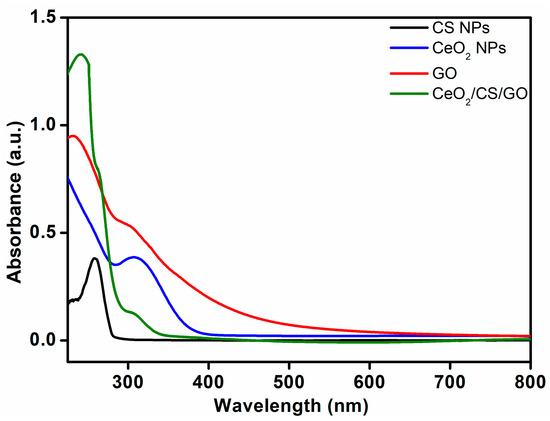 The UV spectrum of CS NP, CeO2 NP, GO, and the CeO2/CS/GO ternary nanocomposite is shown in Figure 5. This spectrum demonstrates the presence of three different peaks at ~230, ~250, and ~300 nm. Typically, the absorbance peak of CeO2 NPs can be observed at a wavelength of ~303 nm, which corresponds to the characteristic absorption peak of Ce4+ of CeO2 NPs, which in this case appears at ~300 nm [26]. Similarly, the absorption spectrum of GO consists of two absorption bands which are usually centered at 234 nm is assigned to the π-π* transition of aromatic C–C bonds of graphene lattice, whereas a shoulder band at 298 nm corresponds to the n-π* transition of C=O bond [27]. However, in this study, both these characteristic peaks of GO are overlapped with the absorption peaks of CeO2 NPs and thus cannot be clearly differentiated. Whereas, the absorption peak at ~250 nm can be attributed to the presence of chitosan, and thus the presence of absorption peaks representing all the components of the composite clearly suggests the formation of CeO2/CS/GO ternary nanocomposites.