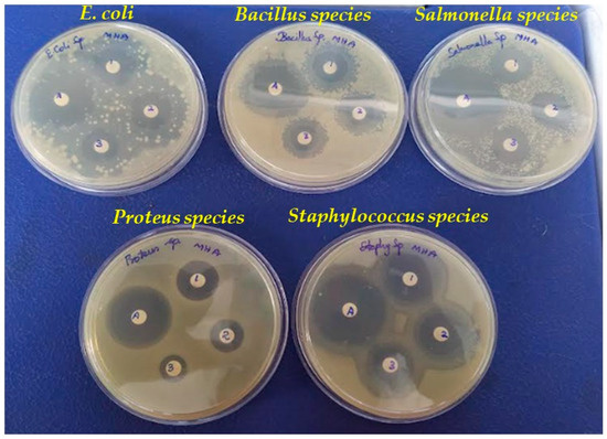 Anti-bacterial activity of CeO2/CS/GO ternary nanocomposite. E. coli, Bacillus species, Salmonella species, Proteus species, and Staphylococcus species. ((1) CeO2/CS/GO ternary nanocomposite (1000 µg/disc), (2) CeO2/CS/GO ternary nanocomposite (750 µg/disc), (3) CeO2/CS/GO ternary nanocomposite (500 µg/disc), and (A) Ampicillin (antibiotic)).