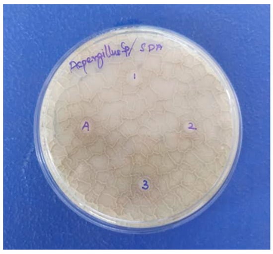 The antifungal activity of the developed CeO2/CS/GO ternary nanocomposite was analyzed against A. niger using the agar disc diffusion method, as shown in Figure 7. At the maximum concentration of 1000 µg/disc of CeO2/CS/GO nanocomposite, the ZOI was recorded to be 4 mm. In contrast, at a minimum concentration of 500 µg/disc of CeO2/CS/GO nanocomposite, the ZOI was 2 mm (Figure 7). Table 2 presents the ZOI values recorded upon incubating A. niger with different nanocomposites. Chitosan may have hindered the integrity of protein biosynthesis and cell surface architecture, which may have had an impact on the growth and development of Aspergillus ochraceus. These results have implications for the use of chitosan as an alternative method of fungi pathogen control [43]. In a study, maximum microbial inhibition was demonstrated by CeO2/GO as a result of the improved photocatalytic activity of cerium oxide and graphene oxide. The transport of photoradicals to the graphene oxide is aided by the light’s excitation of cerium nanoparticles attached to graphene sheets. The balance between adsorption and desorption was upset, making it easy for more charged particles to pass across the molecular matrix. Additionally, layer-structured GO aided in the equally distributed nanoparticle distribution, which may have improved photocatalytic activity [44,45].