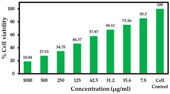 After the cells reached confluence, different concentrations of serially diluted samples were added and incubated for 24 h. After incubation, the samples were removed from the wells and washed with phosphate-buffered saline (pH 7.4) or MEM without serum. Then, 100 µL/well (5 mg/mL) of 0.5% MTT was added and incubated for 4 h. Subsequently, 1 mL DMSO was added to each well. The absorbance was measured at 570 nm using a UV-visible spectrophotometer, and DMSO was used as the blank [22]. The concentration required for IC50 was determined graphically. The percentage cell viability was calculated using the following formula:
