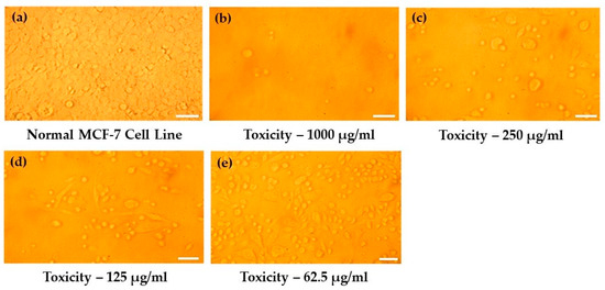 The culture medium containing a minimum of 100,000 MCF-7 cells was incubated with varying concentrations of the CeO2/CS/GO ternary nanocomposite, and the percentage of live cells was recorded as shown in Table 3. Here, IC50 concentration is defined as the concentration of the CeO2/CS/GO ternary nanocomposite for which nearly 50% of MCF-7 cancer cells remain dead. Varying concentrations (1000, 500, 250, 125, 62.5, 31.5, 15.6, and 7.8 µg/mL) of the developed CeO2/CS/GO nanocomposite were used to assess its anti-cancer property against the MCF-7 cell line. The IC50 value was estimated to be 125 µg/mL using Equation (1). The quantitative assessment of the anti-cancer activity of the developed CeO2/CS/GO nanocomposites at various concentrations is presented in Figure 8. Qualitative assessments were performed from the record of the biochemical interactions of the CeO2/CS/GO nanocomposite with MCF-7 cells in the culture medium, as presented in Figure 9. As the concentration of the CeO2/CS/GO nanocomposite increased, the number of cell deaths also increased, which is well presented using various concentrations such as 1000 µg/mL, 250 µg/mL, 125 µg/mL, and 62.5 µg/mL, respectively. Cell death is revealed by the rupture of cells, which leads to a reduction in cell size and a dip in the quantity of cells present in the culture medium, as shown in Figure 9. The %live cells was 18.84 at the maximum concentration of 1000 µg/mL and 85.5 at the minimum concentration of 7.8 µg/mL, respectively. Table 4 presents the mean value plus or minus the standard deviation obtained from the record of the anti-cancer activity of the CeO2/CS/GO nanocomposite at various concentrations with the MCF-7 cell line three times. For the human foreskin fibroblasts (HFF) and lung cell line (A549), the IC50 of ceria-loaded chitosan nanoparticles (CeCh-NPs) was reported to be 50.65 and 131.108 μg/mL, respectively [28]. According to a previous report, the median chitosan–cerium oxide nanoparticle concentrations against AGS, A459, PC3, and HFF cells were about 156.02, 169.1, 155.8, and 307.5 µg/mL, respectively [52]. In a study, after 48 h of incubation with varying concentrations of CeNPs (10 to 100 µg/mL), it was discovered that the cytotoxic effect of CeNPs on HaCaT (normal cell lines) and MCF-7 (cancer cell lines) suspended in Dulbecco’s phosphate buffered saline (DPBS), with a pH of 7.4, is transient, dose-dependent, and depends on the type of cell lines [53]. In another study, a new series of CeO2NPs having different structures and morphologies such as nickel (Ni)-doped CeO2, hollow CeO2 (hCeO2), and hollow CeO2/silicon dioxide (SiO2) (hCeO2/SiO2) NPs were synthesized. Additionally, the results showed that hCeO2/SiO2NPs had a lower half maximum inhibitory concentration (IC50) (18.625 g/mL) than other synthetic drugs. When compared with tumoral cells (HT-29), all four chemicals had a much lower cytotoxic effect on non-cancerous cells (HFFF2). In comparison with the previous reports, the results obtained from the present investigation demonstrate the excellent anti-cancer activity of the developed CeO2/CS/GO nanocomposite against MCF-7 cells.