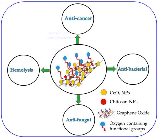 Schematic representation of CeO2/CS/GO ternary nanocomposite and its biological activity.