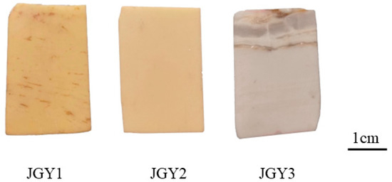 The three samples in this experiment were collected from Shimen Town, Luonan County in the northern foothills of the Qinling Mountains, Shaanxi Province, China. The high-quality dolomite of Luonan County is found in the fourth lithological section of the Longjiayuan Formation, which is a light-gray thin-to-thick laminate dolomite interspersed with flint bands, and part of this geological section is located in Shimen Town. Most of Shimen Town is Neogenic, consisting mainly of a set of terrigenous clast rocks and carbonate sedimentary rock [10]. As shown in Figure 1, all three samples comprise plates of about 3.5 cm × 2.3 cm × 0.7 cm, which are uniform in color (from left to right, they are earthy-yellow, light-yellow, and grayish-white, named JGY1, JGY2, and JGY3 in turn). They have smooth surfaces, fine textures, and clear, neat textures. JGY1 consists of a yellow substrate and a few irregular, short, and thin yellowish-brown mineral strips. JGY2 consists of a light-yellow mineral substrate, and its surface is relatively clean with no impurity minerals visible to the naked eyes. JGY3 consists of a grayish-white mineral base with distinctive laminar mineral bands.