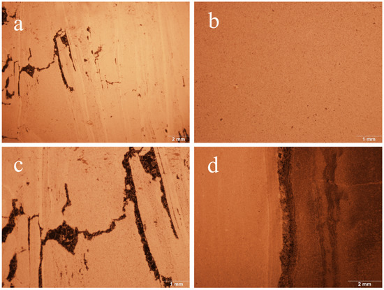 Characteristics of “Jin Gao Yu” under the gemstone microscope. (a) JGY1, magnified 0.63×; vein structure and a few black minerals are visible. (b) JGY2, magnified 1.5×; dense granular structure is visible. (c) JGY1, magnified 1.5×; black minerals are visible. (d) JGY3, magnified 1.0×; black quartz veins are visible.