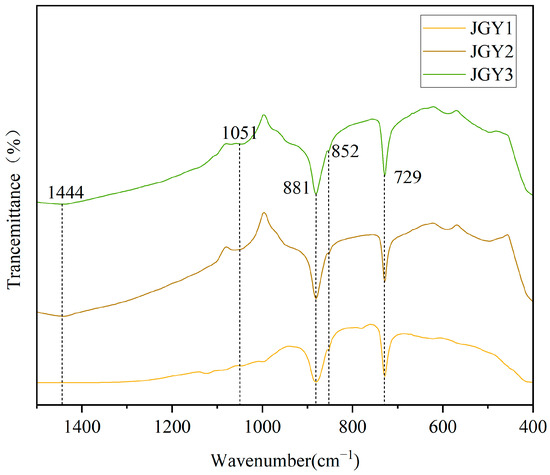 The infrared spectra was measured using the infrared KBr pressing method (transmission) (Figure 4). The results show that the tested samples indicate the absorption of dolomite-group minerals. The Ca2+ and Mg2+ ions inside the dolomite crystals have less influence on the vibration frequency of the groups, and what the infrared spectra present is mainly determined by the vibration of the [CO3]2− groups. The absorption valleys around 1444 cm−1 show [CO3]2− anti-symmetric telescopic vibration; the absorption valleys around 881 cm−1 and 852 cm−1 show [CO3]2− out-of-plane bending vibrational absorption; and the absorption valleys around 729 cm−1 show [CO3]2− in-plane bending vibrational absorption. Moreover, the tested spectrum also shows the absorption valleys around 1051 cm−1, belonging to cerussite, which indicate [CO3]2− in-plane bending vibrational absorption. In addition, an absorption valley is present around 1051 cm−1, caused by [CO3]2− symmetric telescoping vibrations, and it is Raman-active and less frequent in the infrared spectra [11].