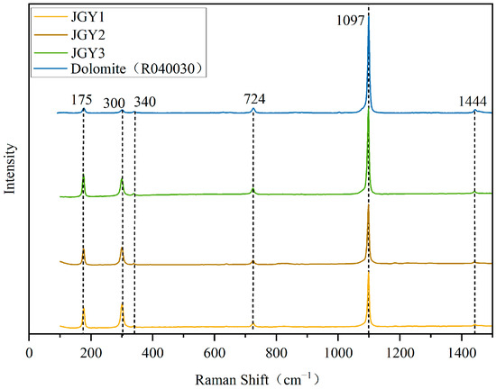 The results of Raman spectroscopic tests on the basal portion of the “Jin Gao Yu” samples are shown in Figure 5. The results of the sample have the characteristic peaks of dolomite (the data on dolomite Raman peaks are from the RRUFF standard card R040030). The antisymmetric stretching vibration of the C-O bond is 1444 cm−1, 1097 cm−1 is the symmetric telescopic vibration of internal CO32−, 725 cm−1 is the symmetric vibration of the in-plane bending of CO32−, 340 cm−1 is the out-of-plane bending vibration of CO32−, and 175 and 300 cm−1 are the internal vibration values of carbonate mineral lattice [12,13,14,15,16,17]. The Raman peaks of carbonate minerals are very similar [18]. The two Raman displacements within the range of 250–350 cm−1 are the characteristic Raman peaks distinguishing the calcite group minerals, and these are caused by the regular alternating arrangement of Ca2+ octahedra and Mg2+ octahedra along the direction of the tertiary axes of the dolomite’s own structure, leading to the splitting of its internal vibrational modes νob into νob and νaob [19]. This indicates that “Jin Gao Yu” belongs to the dolomite group of minerals.
