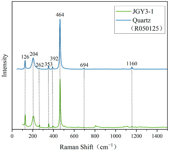 As can be seen, the surface of the sample of “Jin Gao Yu” shows obvious speckled and vein-like impurities. Therefore, the impurities were further tested using Raman spectroscopy. The test results are shown in Figure 6. From Figure 6, one notes that the tested point of JGY3-1 has the characteristic Raman peaks of quartz (the Raman data for quartz are from the RRUFF standard card R050125), and the strongest peak, near 464 cm−1, is caused by the symmetric bending vibration of Si-O, and it is the characteristic Raman peak for identifying quartz [20]. The Raman peaks in the 200–300 cm−1 interval are related to the rotational or translational vibrations of the silica–oxygen tetrahedron [SiO4], those in the 300–600 cm−1 interval are related to the Si-O bending vibrations, those in the 600–800 cm−1 interval are related to the Si-O-Si symmetric telescoping vibrations, and those in the 1000–1200 cm−1 interval are related to the Si-O asymmetric stretching vibration. The rest of the Raman peaks are related to the stretching vibration of M-O, which has an ionic bonding nature, and its coupling vibration, with the bending vibration of Si-O-Si and the stretching vibration of Si-O [21]. These results show that the sample of “Jin Gao Yu” contains quartz impurities.