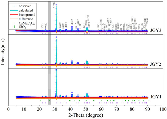 The X-ray diffraction spectrum often reflects information about the composition of a mineral. Three samples of “Jin Gao Yu” were tested using X-ray diffraction spectroscopy, and the results are shown in Figure 7. The XRD results of the sample are consistent with those of dolomite PDF#36-0426. The strongest 2-Theta peak at 30.938° correspond to the crystal plane 104 of dolomite, and the following stronger peaks at 41.127°, 50.526°, 51.068°, and 44.949° correspond to the crystal planes 113, 018, 116, and 202 of dolomite, respectively. Meanwhile, the characteristic peak d values of 0.28845 nm, 0.28831 nm, and 0.28871 nm for the sample of “Jin Gao Yu” (104) are within the range of the characteristic peak d values of dolomite 104 (0.2854–0.2912 nm) [23], indicating that the different colors of the “Jin Gao Yu” and dolomite basically have the same crystal structure. In addition, there is a weak diffraction peak at a d value of 0.33445 nm (as shown in gray bar of Figure 7), which is weakly expressed in JGY1 and JGY2, while the peak is more pronounced in JGY3. This peak was matched to be the diffraction peak of quartz (the standard card of quartz in Figure 7 is PDF#46-1045).