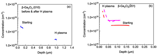 (a) Concentration profiles calculated from C−V measurements for (010) β-Ga2O3 samples treated in H plasma. (b) The same for the () sample. The initial (starting) carrier profiles (red) and those after H plasma exposure (purple) are shown.