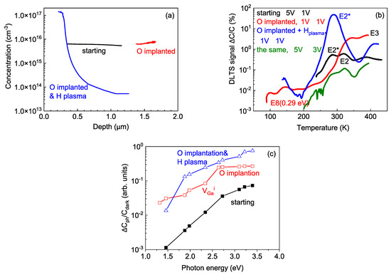 The most likely explanation is that hydrogen enters from the plasma and forms donor complexes with abundant VGai formed by O ions. This results in an increased shallow donor concentration. The C−V profiles suggest that the number of H ions introduced from plasma exposure is sufficient to saturate up to the (VGai−4H) state of ~2 × 1017 cm−3 vacancies to a depth of ~0.3 µm. Thus, the density of H ions overshoots the density of Ga vacancies created by irradiation, and the acceptor states due to VGai-nH complexes, if they are formed, are formed deeper inside the sample. This was indirectly confirmed by C−V profiling with the monochromatic illumination photocapacitance spectra (LCV spectra [36]) displayed in Figure 3c. Before the O irradiation, the main feature of the spectra was due to acceptors with an optical ionization threshold near 1.3 eV. After O implantation, a very prominent center with an optical ionization energy close to 2.3 eV attributed to the VGai acceptors emerged. After H plasma treatment, this center was fully quenched because of the formation of complexes with H ions [30].