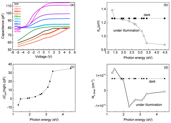 After H plasma treatment, the capacitance versus voltage characteristic was that of an MIS structure (Figure 4). The spectral dependence of these “MIS” characteristics could be deconvoluted into the “oxide” insulator capacitance and the capacitance of the n-region using the values of capacitance in accumulation and depletion [66]. The “oxide” thickness, dox, in the dark was close to the thickness of the heavily damaged region but slightly lower (1.26 µm). With illumination, the thickness of this “oxide” high-resistivity region was first slightly increased to 1.4 µm with a photon energy of 1.35 eV and then gradually decreased with increasing photon energy (Figure 4b). These changes were due to carrier trapping and detrapping effects. The capacitance in depletion behaved correspondingly, indicating that the effective width of the insulating region was also spectrally dependent because part of the implanted layer adjacent to the Schottky diode became more conducting. The corresponding spectral dependence of photocapacitance in accumulation, Cph (high), is shown in Figure 4c. We observed the spectral shift of the voltage corresponding to transition from accumulation to depletion, which allowed us to estimate the change in the sheet density, Ns, of the charge generated in the high-resistivity region from Ns = C(accumulation) × ΔV/(q × S) [66], where C (accumulation) is the capacitance in accumulation, ΔV is the shift of the C−V curve caused by illumination with photons of the given wavelength, q is the charge of the electron and S is the diode area. We did not see evidence of the formation of a conducting n-type or p-type layer at the surface. This might be due to the fact that the density of Ga vacancies greatly increased compared to the 1016 cm−2 O fluence irradiation and the concentration of hydrogen being only sufficient for producing compensating acceptors of VGa, with hydrogen giving rise to the high resistivity. With the (001) orientation, the hydrogen penetration into the sample was 0.3 µm. The situation could become better if HVPE samples with the () orientation were used, so the possibility of achieving the p-n conversion at the surface by H plasma treatment has yet to be proved. Given the situation with respect to variations in defect density created by implantation and the density of hydrogen available for diffusion and complex formation, the task of finding conditions suitable for the preparation of p-type surface films in that way would require optimization.