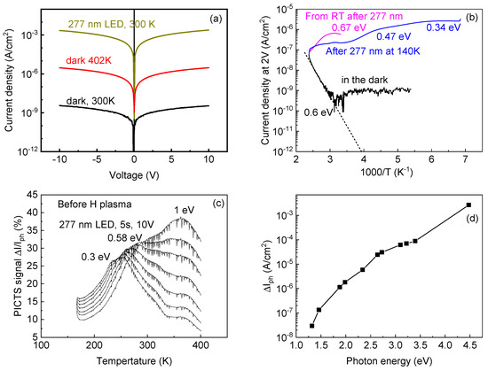 We studied two samples of undoped α-Ga2O3 grown by HVPE in the as-grown state and after H plasma treatment. Figure 5a presents the dark current density dependence on voltage for sample GO1058-2 at 300 K in the dark and under illumination with a wavelength of 277 nm and a dark current density at 402 K, all measured on a Ni Schottky diode. There was no rectification in the Schottky diode because of the high resistance of the sample limiting the current flow. The temperature dependence of the current was strong, and the sample showed a high photocurrent obtained under illumination with 277 nm at an optical output power density of 15 mW/cm2. Figure 5b displays the temperature dependence of the current density measured at 5 V after illumination at room temperature and heating up in the dark to 400 K (magenta line), during subsequent cooling down to 140 K in the dark (black line), and after illumination at 140 K and heating up (blue line). From the temperature dependence during cooling from 400 K in the dark (black line), the Fermi level in the film was pinned near EC−0.6 eV. The peaks of the blue and magenta lines corresponding to carrier emission from deep traps filled with light at lower temperature (thermally stimulated current (TSC) [71]) indicate the presence of centers with ionization energies of 0.3, 0.5 and 0.6 eV. Such centers are often observed in undoped HVPE-grown α-Ga2O3 [59]. The PICTS spectra measurements in Figure 5c point to the existence of 0.3 and 0.6 eV traps, also seen in Figure 5b, and an additional deep trap near EC−1.2 eV often encountered in α-Ga2O3 films. The photocurrent at the 5 V spectrum in Figure 5d shows traps filled with electrons and having optical ionization thresholds of 1.3 eV, 2.3 eV and 3.1 eV. No capacitance could be measured for such an as-grown undoped sample.