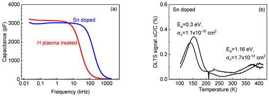 After the hydrogen plasma treatment, the capacitance of the sample was easily measured and the carrier density was high (9 × 1018 cm−3), similar to the capacitance of the heavily Sn-doped α-Ga2O3 film with a net donor density of 8.4 × 1018 cm−3 (Figure 6a). No signal from deep traps could be detected in the H plasma-treated sample, in contrast to the Sn-doped sample, where deep traps near EC−0.3 eV and EC−1.2 eV with concentrations near 6 × 1016 cm−3 and 2 × 1016 cm−3, respectively, could be seen (Figure 6b).