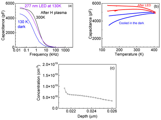 For the second undoped α-Ga2O3 sample, GO-1062-2, with properties before hydrogen plasma treatment similar to those of GO-1058-2 hydrogen plasma exposure, there was also a dramatic increase in the capacitance of the Schottky diodes prepared on the treated film (Figure 7a). Cooling the sample to 130 K led to some decrease in capacitance because of freezing out of electrons supplied by the centers introduced by the H plasma. However, illumination with the 277 nm LED increased the capacitance up to the level comparable with room temperature by additional injection of carriers. This capacitance was persistent after the light was switched off and even after the forward bias pulse of 10 s and 1 V was applied. Capacitances at different frequencies measured after illumination remained considerably higher than for the measurement while cooling in the dark up to temperatures close to 400 K, thus suggesting the existence of a barrier for the capture of electrons by centers introduced by the H plasma, similar to the well-known case of DX-like centers [28]. The density of such centers supplying electrons was quite high, close to 1019 cm−3, but slowly decreased with depth (Figure 7c).