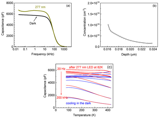 After H plasma treatment, the capacitance became very high even for undoped samples. Figure 8a shows the data for one such undoped sample at room temperature in the dark and under 277 nm illumination. The concentration obtained from C−V profiling was close to 1019 cm−3 but gradually decreased away from the surface (Figure 8b). The profiles showed sensitivity to light and to heating and cooling under bias, but these features need better understanding. Cooling the sample in the dark led to about 20% decrease in capacitance on the plateau of the C−f dependence. (Figure 8c shows the data for several frequencies on the plateau and for the region of capacitance roll-off with frequency.) After illumination, the capacitance on the plateau became slightly higher than at room temperature and remained persistently high at low temperatures. As the temperature after illumination was increasing, the persistent capacitance stayed virtually unchanged and started to decrease and merged with the dark capacitance in the C versus T dependences above 410 K, slightly increasing with frequency. This behavior is similar to the one observed for the undoped α-Ga2O3 film subjected to plasma treatment (Figure 7b). The activation energies of the carriers that freeze out in the dark as measured in the forward current temperature dependence are also similar, close to 0.1 eV. However, for the ELOG κ-Ga2O3 sample there is a distinction. For frequencies higher than those corresponding to the plateau in the C−f dependence, the temperatures of merging of the persistent and dark C−T curves are lower than for frequencies on the plateau. Moreover, the temperatures of the merging become lower for increasing frequencies. The phenomenon is not fully understood but could be related to the fact that the ELOG κ-Ga2O3 films consist of high-crystalline-quality window regions with a width of 20 µm and of highly defective wing regions with a width of 5 µm. Our measurements performed for Sn-doped films suggest that the wing regions are more resistive and that there is a potential barrier for electrons to penetrate from the wing into the window region. When measuring the capacitance on the C−f plateau, one mostly probes the higher area wing region. However, for frequencies higher than the frequencies corresponding to the plateau, the measured capacitance, C(f), decreases with angular frequency, ω = 2πf, compared to the frequency on the plateau, C0, as C(ω) = C0/[1 + (ωRsC0)2] and is a strong function of the series resistance, Rs [71]. In ELOG κ-Ga2O3, Rs is a function of the potential barrier height between the wing and the window. Illumination decreases this barrier height and increases the capacitance at a high frequency, but the barrier height between the two regions must be lower than the barrier height for the capture of electrons by the centers supplying electrons. This leads to a lower temperature of merging between the dark capacitance and persistent capacitance. However, the detailed picture needs to be established from additional experiments.