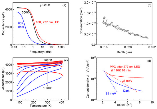 (a) The 300 K and 80 K dark C−f characteristics and 80 K C−f characteristic measured under 277 nm LED illumination. (b) Concentration profile. (c) C−T characteristics measured while cooling in the dark (blue lines) and while heating up after illumination for different measurement frequencies. (d) TSC spectra for the γ-GaO1 sample implanted with Ga.