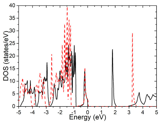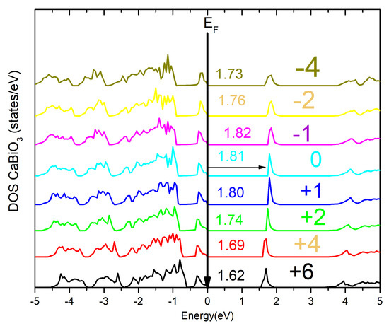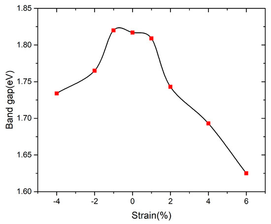 There are small changes in both the total DOS and band gap with strain, as shown in Figure 4 and Figure 5. The band gap is largest at ~1.8 eV for the unstrained structure and decreases a bit to 1.6–1.7 eV for strained structures. The center of valence states is slightly pushed up to the Fermi level with increasing tensile strain, as can be seen by the decreasing gap between the peak just before the Fermi level and the wide band before that peak. The same happens in other oxides [34].