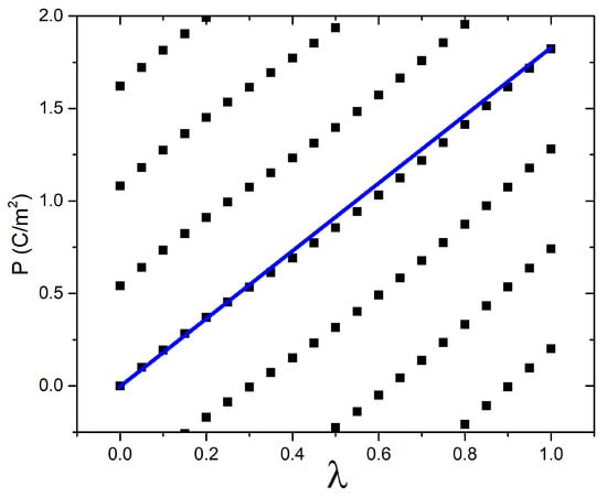 Due to the multi-valuedness of the bulk polarization [26,27], with the polarization quantum equal to 0.54 C/m2, several points are considered in the polarization path, from the centrosymmetric space group R-3 (λ = 0) to the non-perovskite structure R3 to remove the ambiguity. The calculated polarization difference is shown by the blue line and amounts to 1.82 C/m2 (or 182 µC/cm2) along the [001] direction in the hexagonal setting, which is a very high value when compared with most ferroelectric compounds. For example, BiFeO3 is known to have a very high polarization ~1.0 C/m2, which is still much smaller than the value calculated here. We checked the polarization with the VASP code and PAW method, with the optimized VASP lattice parameters shown in Table 1 (very similar to the QE parameters), and obtained the same final total polarization difference. Materials with high polarization would benefit applications such as ferroelectric random-access memories (FeRAM) and capacitors [32].