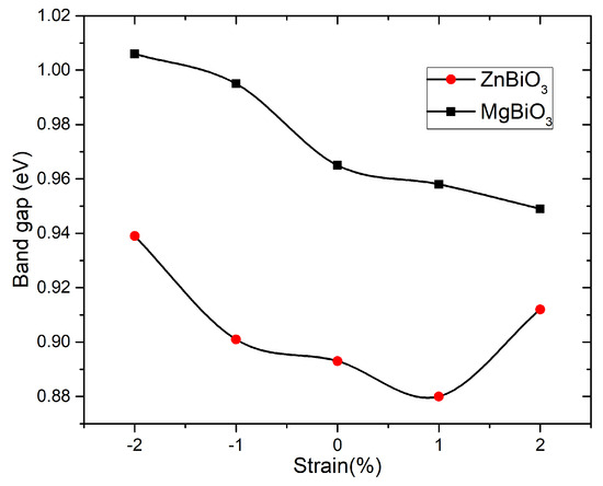 Bandgap (eV) as a function of the in-plane strain for perovskites ZnBiO3 and MgBiO3.