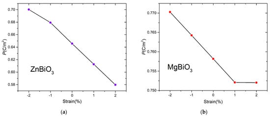 Polarization as a function of in-plane strain (%) relative to the optimized PBEsol structure (0%) for (a) ZnBiO3 and (b) MgBiO3.