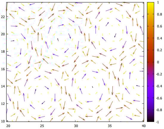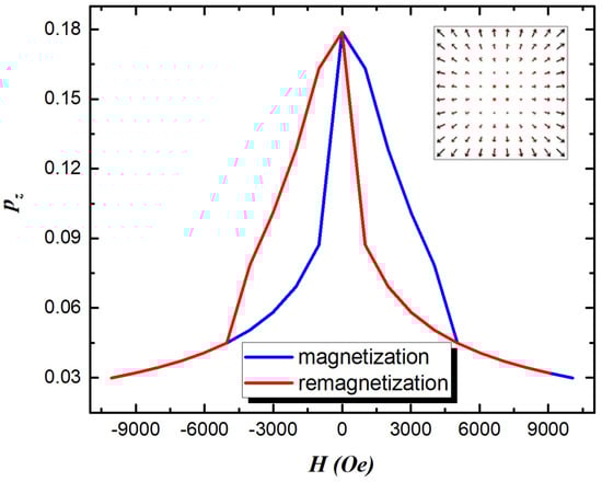 - At first, we calculated the ground magnetic states in the system when magnetic anisotropy and the external magnetic field are absent (K = 0, H = 0). The results of these calculations are shown in Figure 2. This result shows that the DMI leads to the stabilization of skyrmion-like states. One can see the closely packed skyrmion periodic structure with small local defects stabilized by the interfacial DMI (D = 0.5), and the magnetoelectric interaction parameter is taken: .