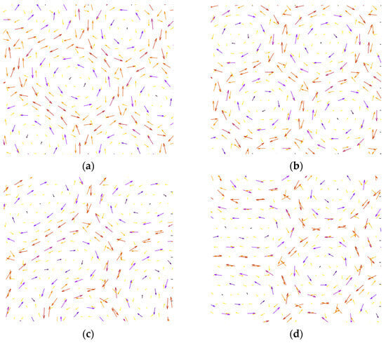 - Then, we considered the influence of in-plane magnetic anisotropy. Plots illustrating transformations of spin structures at the gradual change of the magnetic anisotropy constant K are shown in Figure 3. As seen in Figure 3a,b, when the magnetic anisotropy constant changes slightly, the gradual destruction of the skyrmion lattice phase is observed, which is manifested in an increase in the size and distortion of the skyrmion structure. With a further increase in the anisotropy constant (Figure 3c,d), the skyrmion lattice becomes destroyed, and a transition to the antiferromagnetic phase occurs.