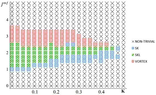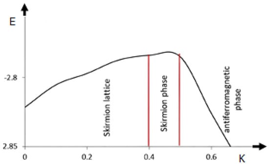- The phase diagram of the transitions between three phases dependent on the magnetic anisotropy constant is shown in Figure 4. According to the results shown in Figure 4, phase transition from the skyrmion lattice into the skyrmion phase and, afterwards, to the uniform antiferromagnetic structure can occur even in the absence of an external magnetic field and is regulated by magnetic anisotropy.
