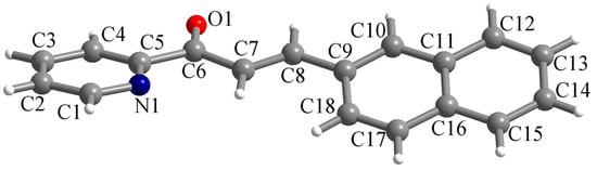 The ligand L crystallizes in the monoclinic P21/n space group with one molecule in the asymmetric unit. The molecular structure of the chalcone is presented in Figure 1. The two aromatic systems (the pyridyl and naphthyl fragments) within the molecule are not coplanar. The dihedral angle between the mean planes of the pyridyl and naphthyl fragments is 26.2°. The bond lengths for the C6–O1 and C7–C8 bonds are 1.2186(16) and 1.325(2) Å, confirming their double-bond nature.