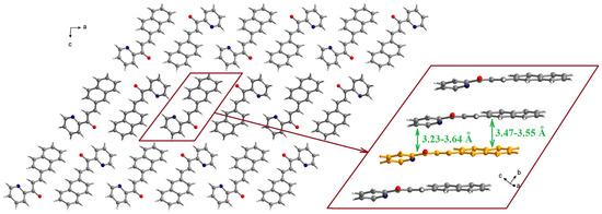 The molecules are organized in piles running along the crystallographic b axis (Figure 2). Within a pile, the naphthyl fragment of one molecule establishes π-π interactions with the naphthyl fragments of neighboring molecules with separations of 3.47–3.55 Å (the inset of Figure 2). The pyridyl moieties are involved in π-π interactions with the pyridyl fragments of neighboring molecules (3.54–3.64 Å) and, also, with the C-C double bond of one neighboring molecule (3.23 Å).