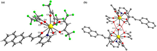 Perspective views of the molecular structure of the complex [Eu(L)(hfac)3(H2O)] (a) and of the supramolecular dimers generated by hydrogen interactions involving the coordinated water molecule (b)—the H and F atoms of the organic ligands were omitted for clarity; symmetry code: ′ = 1 − x, 1 − y, 1 − z).