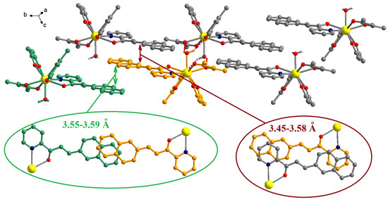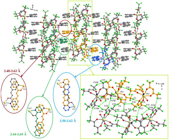 The examination of the packing diagrams shows an organization in layers of the complexes in the crystallographic ab plane (Figure 6). Within the layers, a segregation of the two types of ligands can be observed. The chalcone ligands form piles along the crystallographic b axis by π-π interactions. There are three different types of π-π interactions with separation of 3.40–3.63, 3.44–3.65, and 3.50–3.62 Å. Details of the overlapping modes are presented in the insets of Figure 6. The CF3 groups of hfac ligands establish F···F interactions generating fluorinated pillars that also run along the crystallographic b axis (Figure 6). The most F···F interactions are in the 2.82–3.24 Å range (Table 2). These values correspond with the F···F interactions reported as a driving force for the self-assembly of fluorinated compounds [23] and, also, are similar to values found by us in other lanthanide(III) complexes with hfac ligands [24].