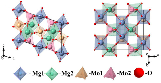 Structure of MgMoO4 in two crystallographic projections (black lines, unit-cell). Reprinted with permission from Ref. [35].