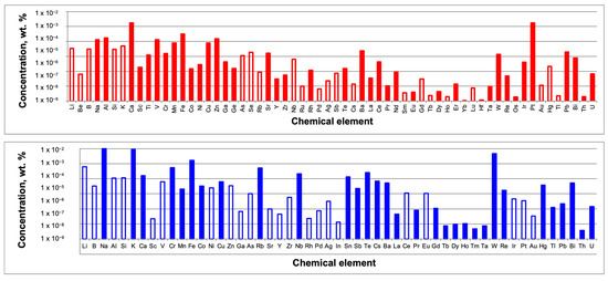 For the charge synthesis we have used the following highly pure starting materials: MgO (Sigma-Aldrich, Burlington, MA, USA), MoO3 (Lankhit Ltd., Moscow, Russia) and Nd2O3 (Nd-E, OST 48-200-81 post-box M 5998, former USSR). Firstly, we have measured the actual accidental impurity compositions of MgO and MoO3 by inductively-coupled plasma mass-spectrometry (ICP MS) analysis. The measurements were performed on a NexION 300D inductively coupled plasma mass spectrometer (PerkinElmer Inc., Waltham, MA, USA) using the kinetic energy discrimination mode. The TotalQuant method [53] was used for the determination of the concentrations of 65 chemical elements. The standard solutions (PerkinElmer Inc., Shelton, CT, USA) were used for calibration. The results of the measurements are presented in Figure 2. The data for Mg, Mo and the elements with concentrations below 1×10−8 wt.% (0.1 ppb) are omitted in both diagrams. Along with that, Ti and Cd concentrations in MoO3 cannot be measured by ICP MS analysis because of the interference of the signals of these ions with those of Mo2+ and MoO+ ions, respectively.