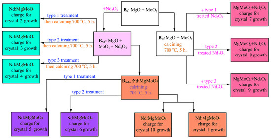 Finally, the Bu batch containing the calcined undoped charge was divided into three equal parts. Each of these parts was then doped with a corresponding portion of Nd2O3. Each portion of Nd2O3 was preliminarily subjected to a different type of special treatment. The obtained batches of the charge (charges 7, 8 and 9) were then used for growth of Nd:MgMoO4 crystals 7, 8 and 9. The procedures for preparation of the charges for growth of the studied crystals are summarized in Figure 3.