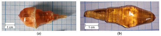 Photos of crystal 1 with numerous “mush” captures (a) and of crystal 3 with no “mush” captures [31] (b).