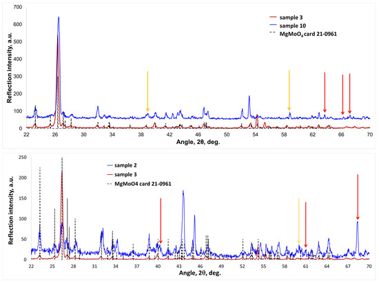 We believe that the above-noted refractory crust, formed at the surfaces of the melts 5 and 6 during pre-melting of the charges, has the same nature as the “mush.” We attempted to analyze the phase compositions of these inclusions by X-ray powder diffraction (XRD) analysis using a Bruker D8 Discover A25 DaVinci X-ray diffractometer over a 2θ range of 10–70°, with a step size of 0.02° and step exposure time of 1.5 s. In fact, some of the XRD pattern appeared to contain the reflexes that are barely recognizable as originating from the main MgMoO4 crystalline phase (JCPDS file 21-0961 Figure 6, yellow arrows) or cannot be identified as the main phase at all (Figure 6, red arrows).