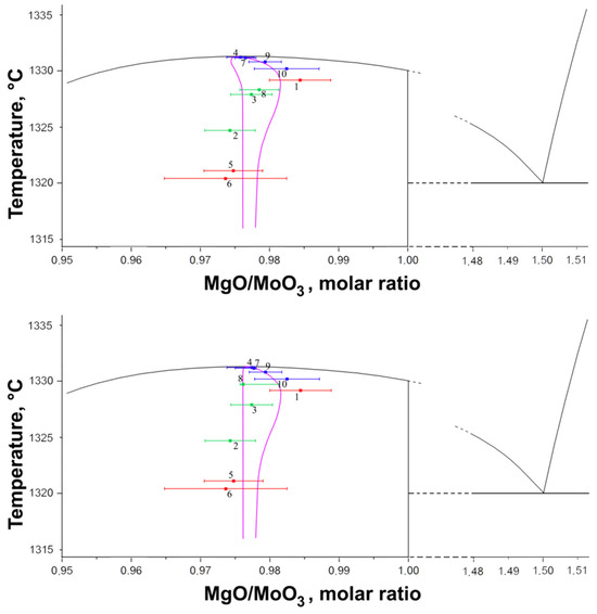 The probable assumptions are as follows (the corresponding supposed view of the vicinity of the MgMoO4 stoichiometry point at the MgO-MoO3 phase diagram is presented in the upper panel of Figure 8):