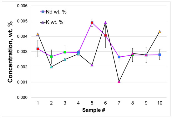 The measured Nd concentrations are presented in Figure 10. Among the revealed accidental impurities, one should especially mention potassium. Its concentrations are also given in Figure 10.