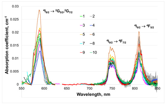 Note that quite close values of Nd3+ optical absorption coefficients for samples 1–4 and 7–10 reproduce/confirm rather small variations in the actual neodymium concentrations in the crystals revealed by ICP MS analysis. Meanwhile, the increased Nd3+ optical absorption coefficients for samples 5 and 6 reflect the increased actual neodymium concentrations in the latter samples although, unfortunately, with substantial measurement errors.